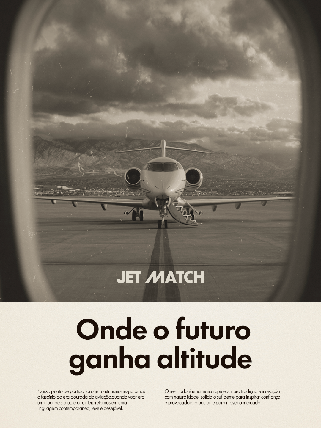 A JetMatch surge para romper com o passado da aviação privada. Inspirados pelo retrofuturismo, recuperamos o encanto da era em que voar era um gesto de status e o traduzimos em uma linguagem contemporânea, leve e sofisticada. O resultado é uma marca que une tradição e inovação sem concessões: confiável para quem conhece o setor, relevante para quem lidera seu futuro.